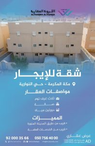 4 نوفمبر، 2025 By الثروة العقارية التسويق العقاري, فرص للتأجير شقة للإيجار حي النوارية بمكة Previous Post شقة للإيجار بحي العارض Next Post للبيع فيلا بحي العارض 312.5م