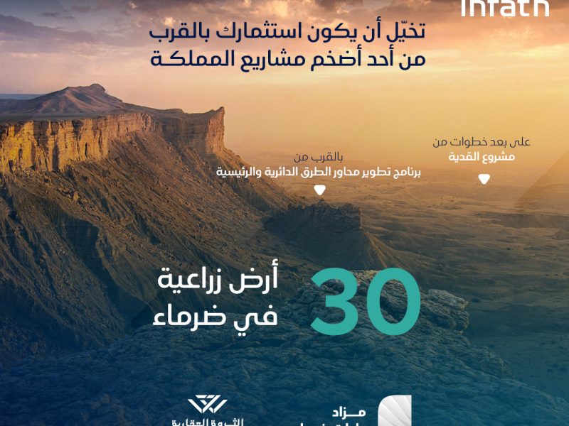 في مزاد واحات ضرماء 30فرصة عقارية زراعية في ضرماء بمساحات تتجاوز 33 مليون متر مربع. تتميز بقربها من مشروع القدية. كتيّب المزاد: https://bit.ly/460xtCh يقام المزاد إلكترونياً عبر منصة مباشر للمزادات ابتداءَ من الثلاثاء ٣١ مارس وحتى الاحد٥ أبريل 2026م للتواصل: 0550444360 – 0552204959– 920003566 @infath_sa | @infathAuctions |