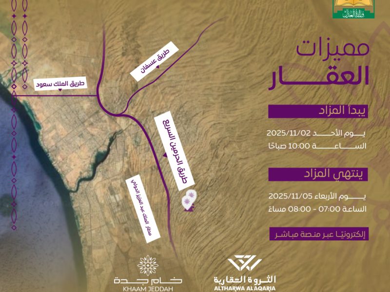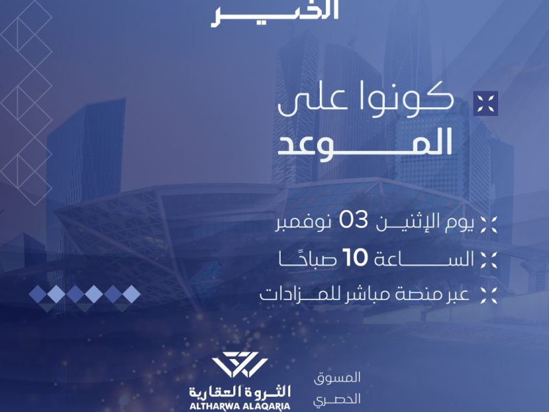 في مزاد جواهر الرياض 10 فرص عقارية سكنية تجارية زراعية في العاصمة الرياض بحي القيروان و المصيف و النزهة و السليمانية و الصحافة والعارض و الوادي و العمارية كتيب المزاد: https://bit.ly/4ob15nI يقام المزاد يوم الأربعاء 19 نوفمبر وينتهي يوم الأحد ٢٣ نوفمبر إلكترونيا عبر منصة مباشـر للمـزادات للتواصل: 920003566 – […]